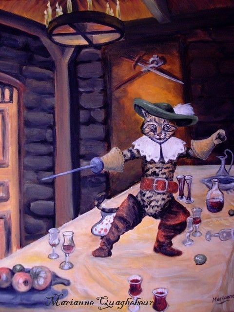 Voici une acrylique qui date de 2009, mon premier tableau ayant pour sujet Le Chat Botté, ce tableau me fut inspiré par une visite au Château de Breteuil, un endroit chargé d'histoire, mais aussi une belle promenade parmi les personnages des contes de Perrault